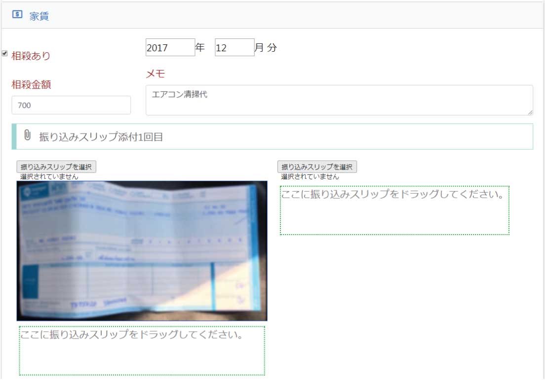 毎月の家賃お支払い後の連絡は、スリップの写真を撮影してシステムの家賃の欄に添付してください。 写真を添付して更新をすると【○月の家賃のお支払い情報】としてオーナー様のメールに自動送信されます。